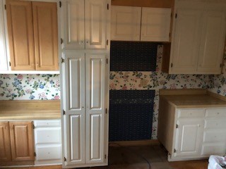 We removed all cabinets on the right side of the kitchen, as it was way too busy, saving only the tall cabinet. We removed all appliances, flooring, countertops, and wallpaper. Cleaned up the trim around the window to provide a more updated look. We expanded the kitchen entrance to create a more seamless flow with the dining and living room. The space will feel larger and more connected when we're done.