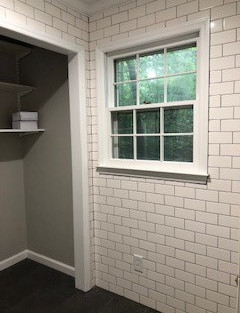 The laundry room had 3 layers of wall paper - not kidding! It was nearly impossible to remove. So, instead of fighting with that, we decided to install subway tiles from floor to ceiling. The combination of the cool white tiles and the warm cedar planks provides an amazing contrast to the loft space. #cedar