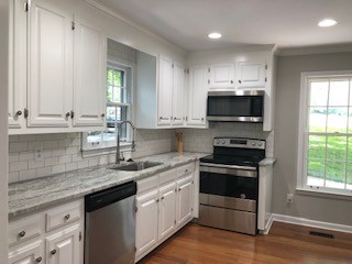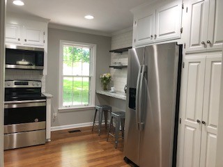 All cabinetry was sanded down and painted in crisp white. Pot lights were added in the ceiling for more improved lighting. New granite counter tops were installed, subway tile backsplash, new appliances and beautiful bamboo flooring.